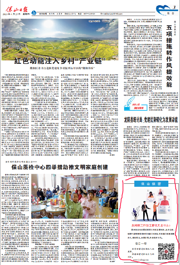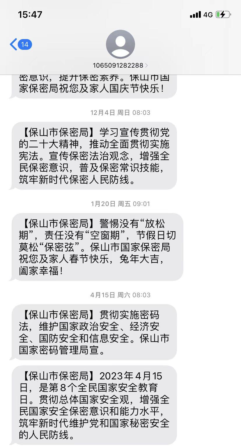 在《保山日报》开设专栏“每周一鉴”进行保密知识科普,在保山广播电视台一套、二套循环播放保密公益宣传片,观看人数达100余万人(次);在全市范围内开展了以宣传国家安全理念、保密常识、方法技能为主题的“人人话保密”短视频征集活动,并选送了15个优秀作品到省国家保密局参评,全面激发了各部门的参与积极性。