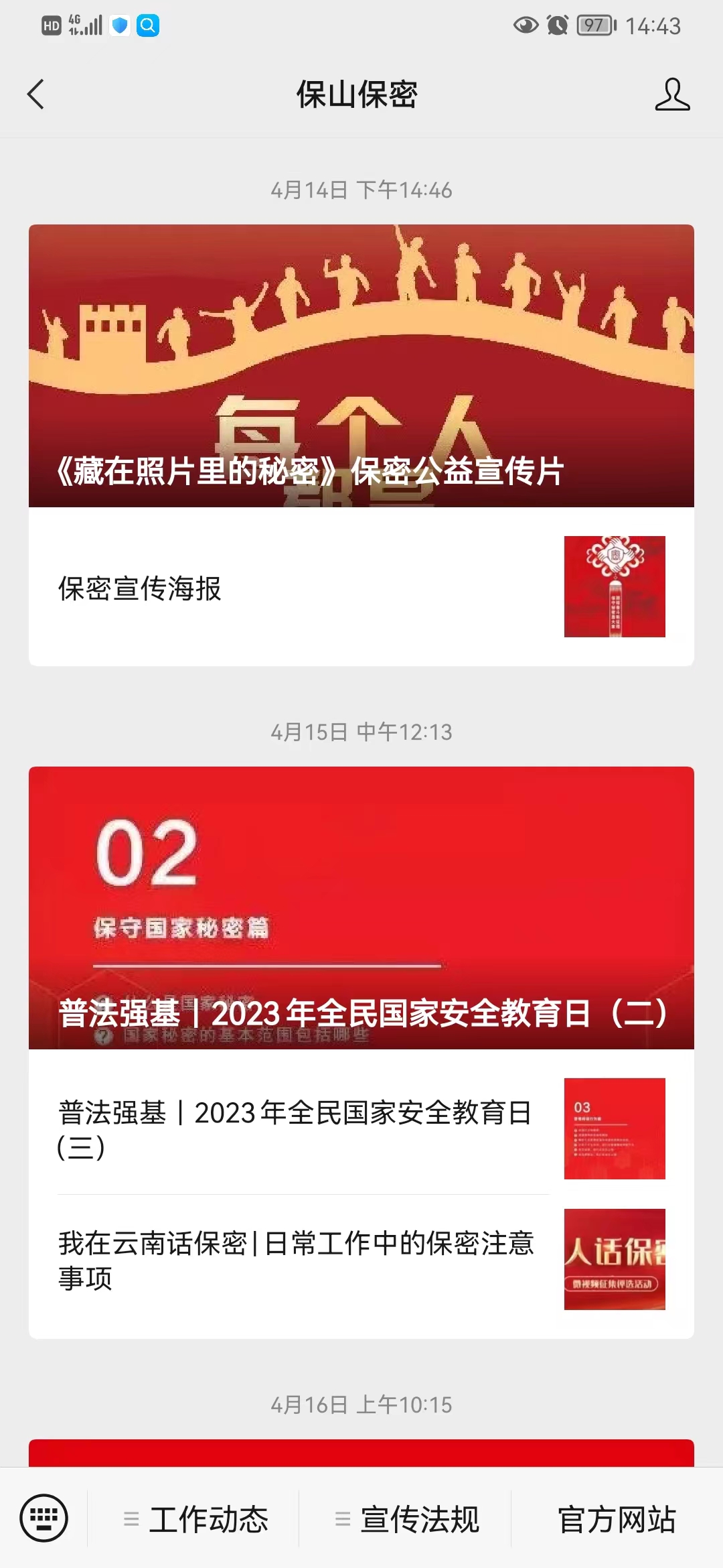 为使国家安全意识传的更广、更深入人心,市委保密办印制了10张专题海报,并利用“保山保密”微信公众号连续发布知识科普类内容10期,宣传作用发挥明显。同时,将全部宣传资源与各地各部门共享,上下形成联动,全市10余个官方微信公众号、微信视频号及保山新闻网等新媒体共宣传国家安全及保密相关文章、视频100余篇,在全市范围内形成了宣传合力,在全市上下织牢了保密安全意识防护网。