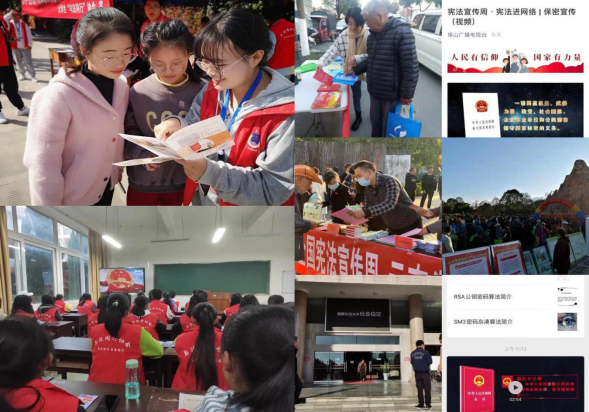 线上为主,抓总抓全。以“保密观”为通用名转发保密知识和保密常识及网络答题;与市网信办联手在各县(市、区)广播电视台和微信公众号推送保密宣传公益广告、保密常识动漫及保密知识,受到了上万网友点赞、转发。同时,保山技师学院、保山中医专科学校、街道、社区及机关单位的门户网站和电子屏均投放保密宣传动漫广告;向全市领导干部、涉密人员、军队转业干部发送保密警示短信4000余条,进一步扩大了“12·4”国家宪法日暨全国法制宣传日的宣传覆盖率,增强普法实效性,提升宣传效果。