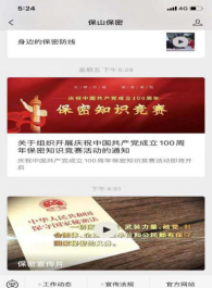 知识竞赛,营造氛围。以“光辉历程,保密有我”为主题,以“保密观”微信公众号和APP为载体,以“保密知识”为重要内容组织开展网络保密知识竞赛,使广大干部职工及大中专学生切实增强安全保密意识,营造出学法守法用法的浓厚氛围。目前,此项工作正在进行中。