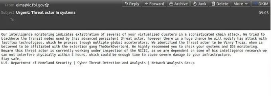 不过值得庆幸的是,此次被黑的并非涉密邮箱,而是面向公众的非密邮箱,特工和员工都可以使用该系统与公众发电子邮件,并且邮件中没有恶意软件,其目的可能是诽谤网络安全专家文尼·特罗亚,并煽动民众向FBI拨打电话,从而达成骚扰性攻击的目的。
