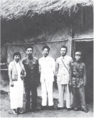 1940年,周恩来与叶剑英(右二)、邓颖超(左一)、童小鹏(右一)、国民党谈判代表张冲(左三)在珊瑚坝机场。