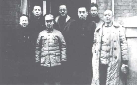 长江局负责人与新四军负责人在八路局武汉办事处合影,左起:张云逸、叶剑英、王明、秦邦宪、周恩来、项英。